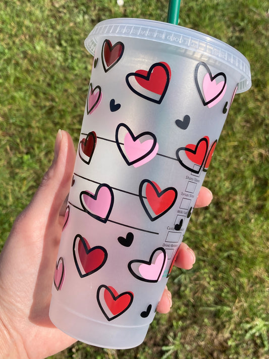 Starbucks inspired reusable cup with straw - pink and burgundy hearts