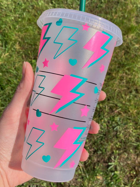 Starbucks inspired reusable cup with straw - neon pink lightning bolts