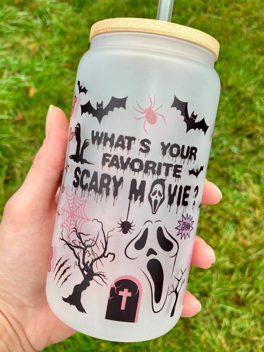 Pink Ghostface Scream - Libbey cup - glass can with bamboo lid and glass straw