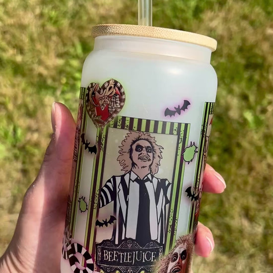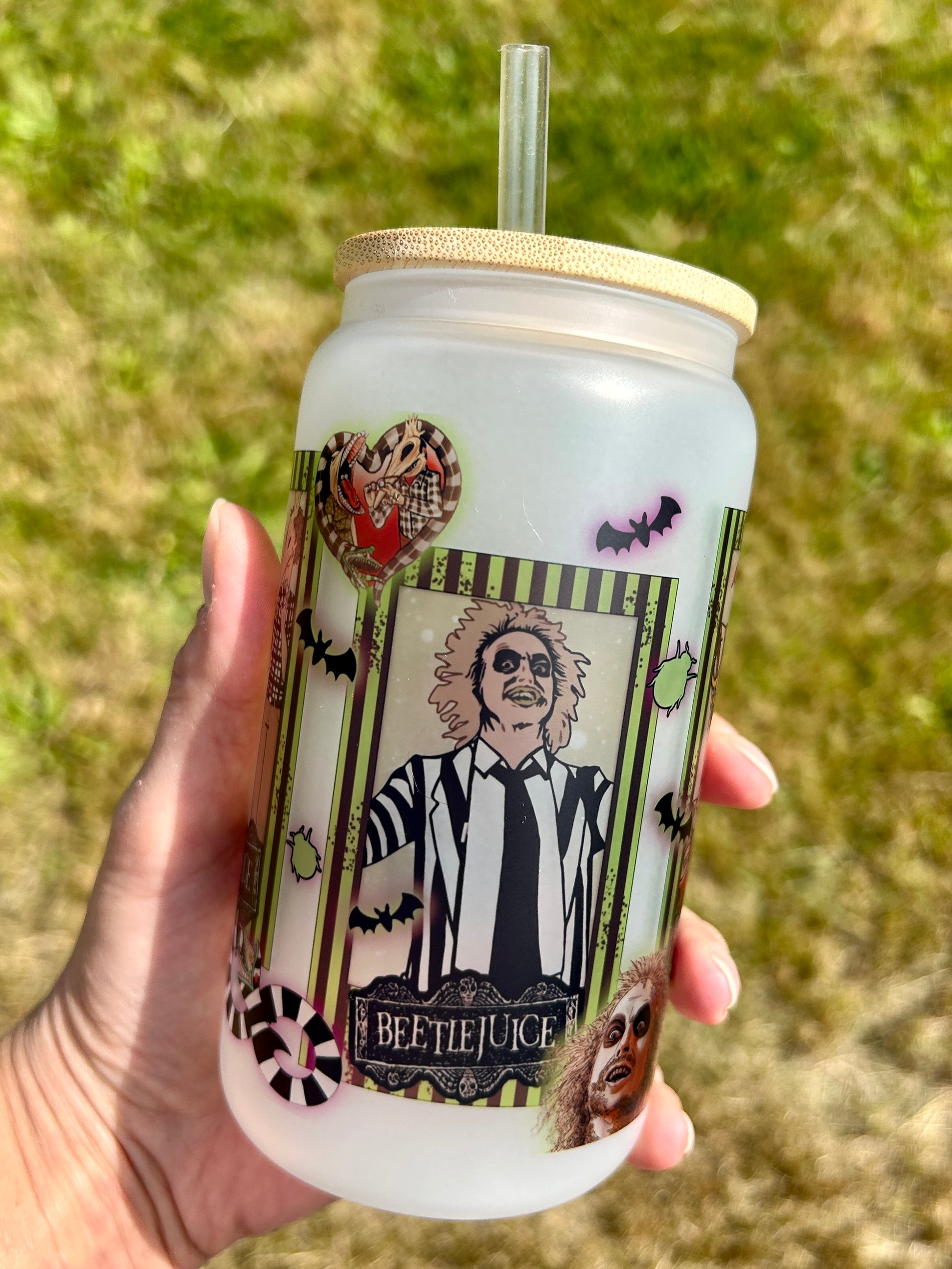 Beetlejuice - Libbey cup - glass can with bamboo lid and glass straw