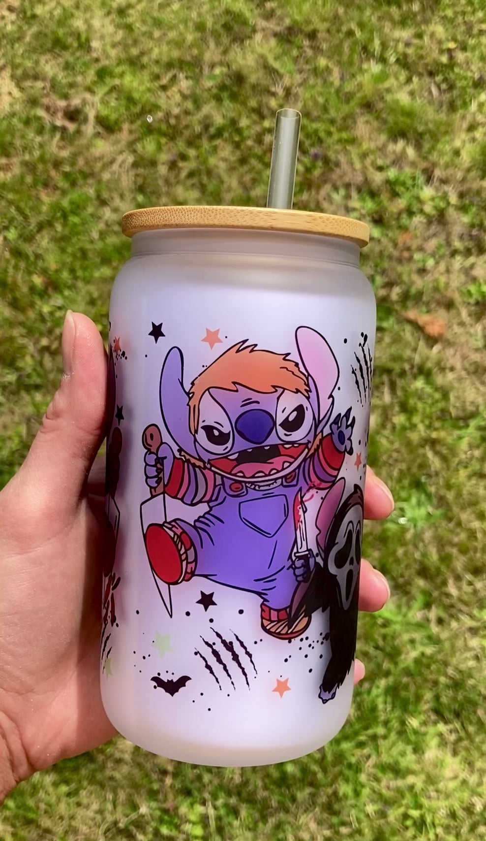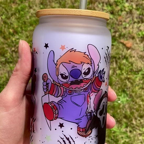 Cute Stitch Horror Movie Villains - Libbey cup - glass can with bamboo lid and glass straw