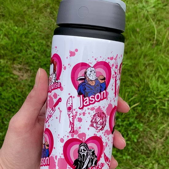 Quench your thirst in style with this 600ml water bottle, featuring a custom design inspired by your favourite horror movie villains!