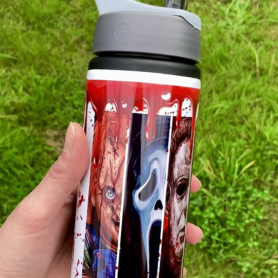 Quench your thirst in style with this 600ml water bottle, featuring a custom design inspired by your favourite horror movie villains!