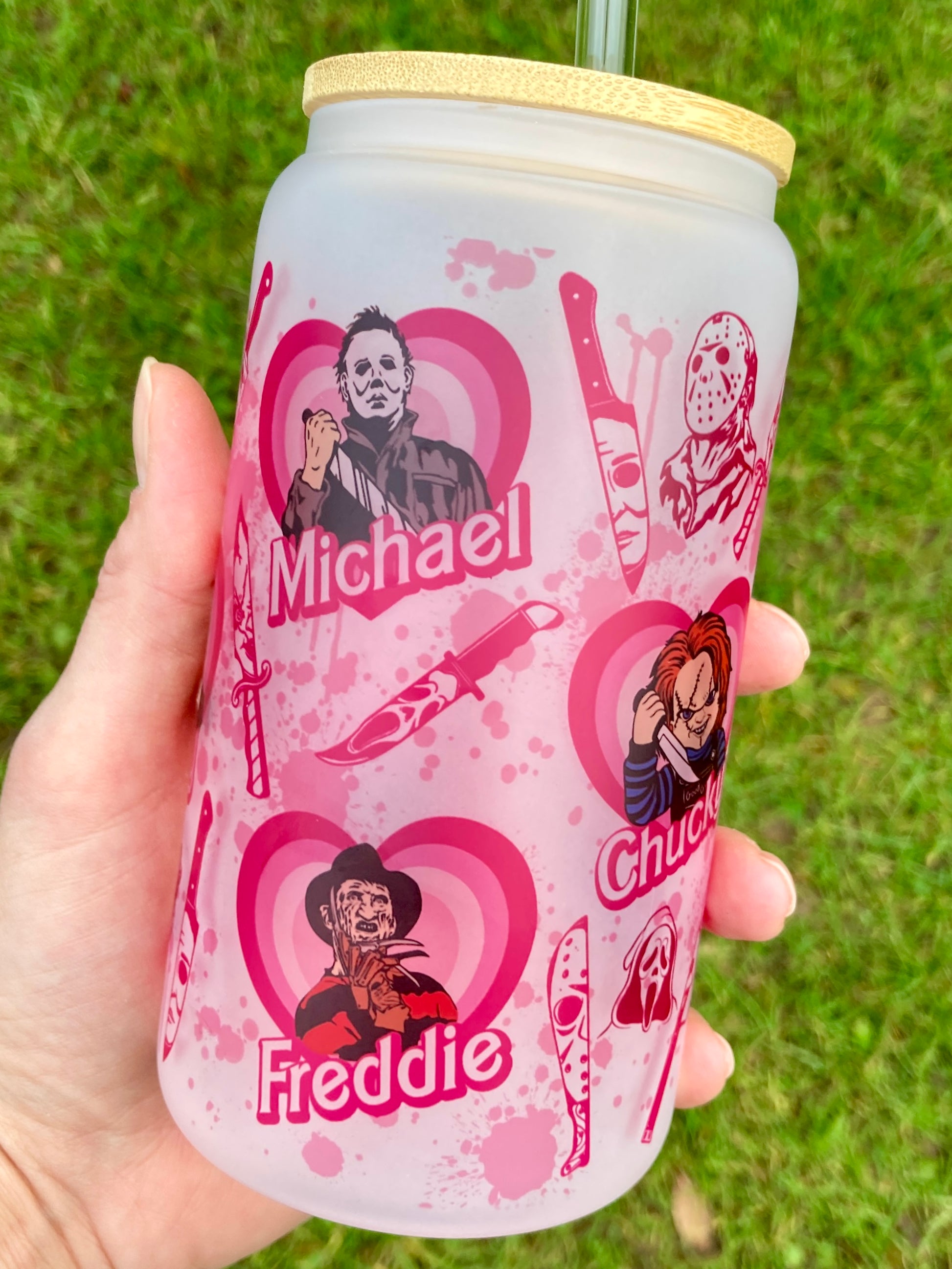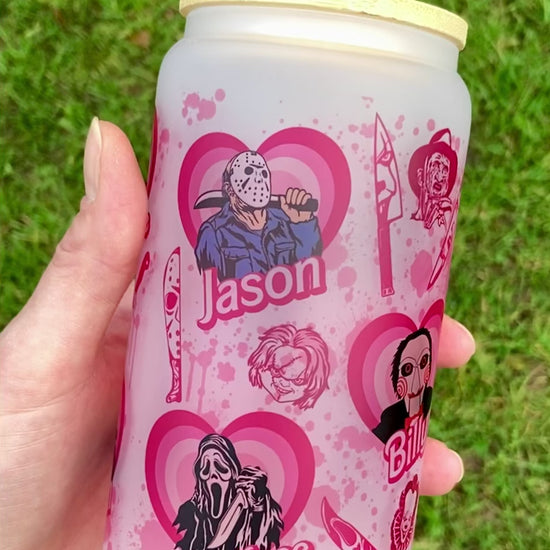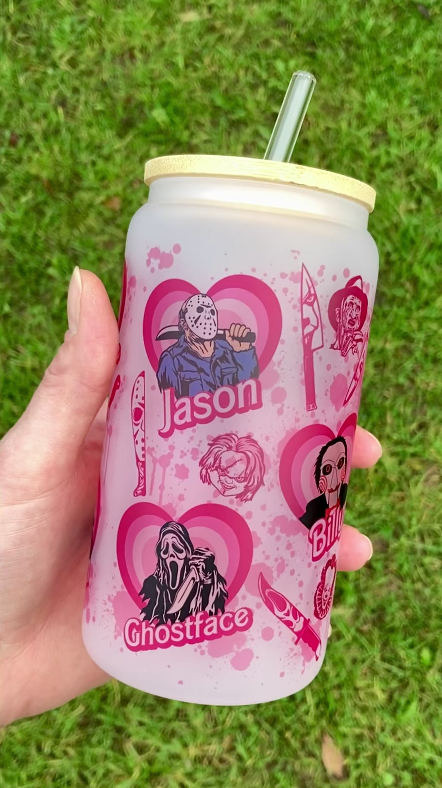 Horror Villains Pink - Libbey cup - glass can with bamboo lid and glass straw
