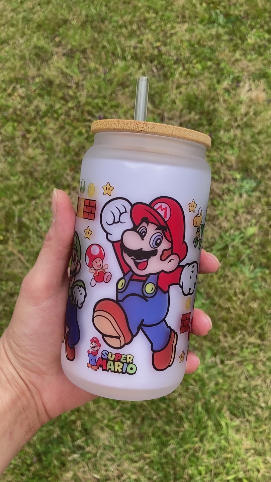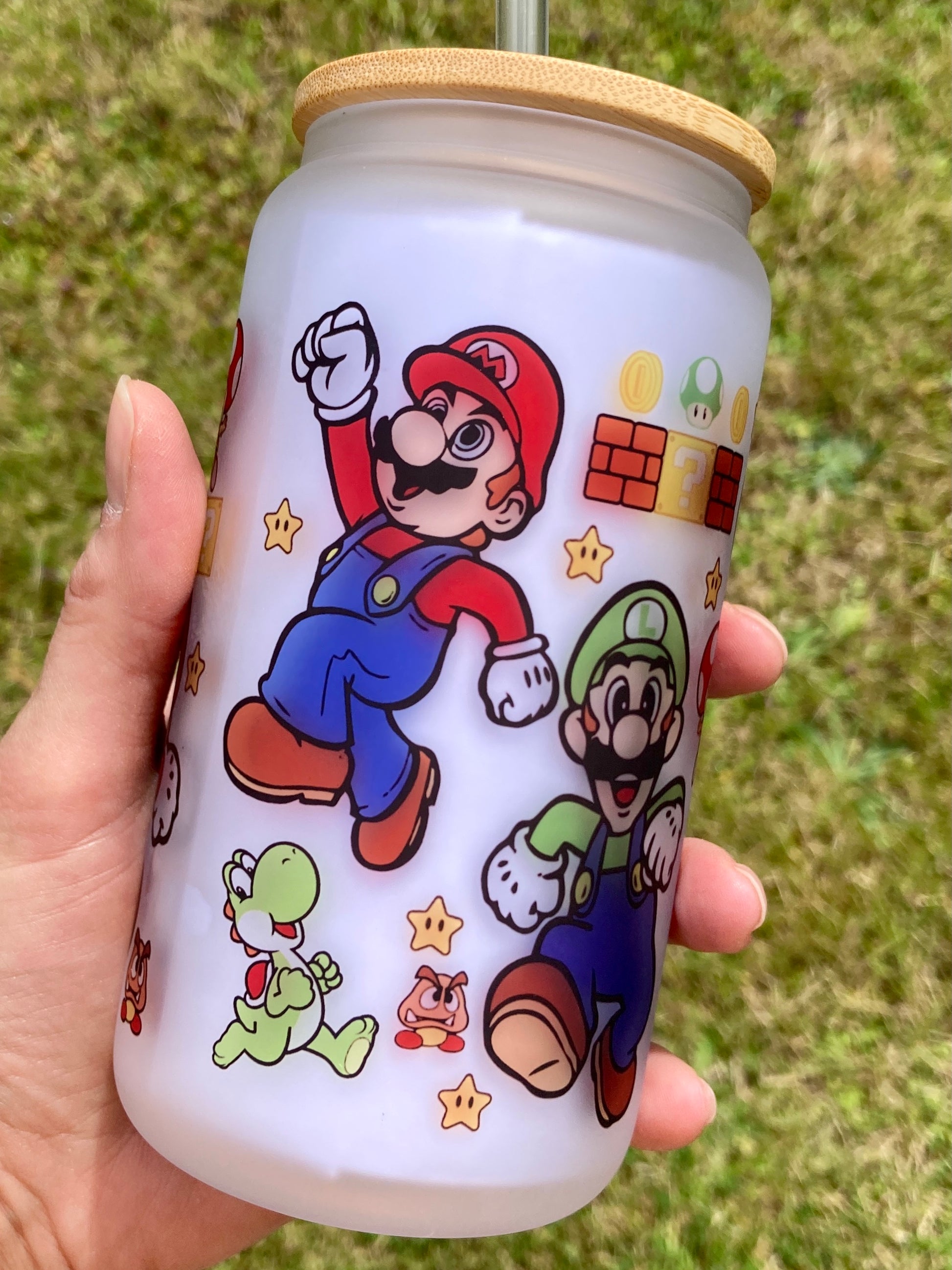 Mario Bros - Libbey cup - glass can with bamboo lid and glass straw