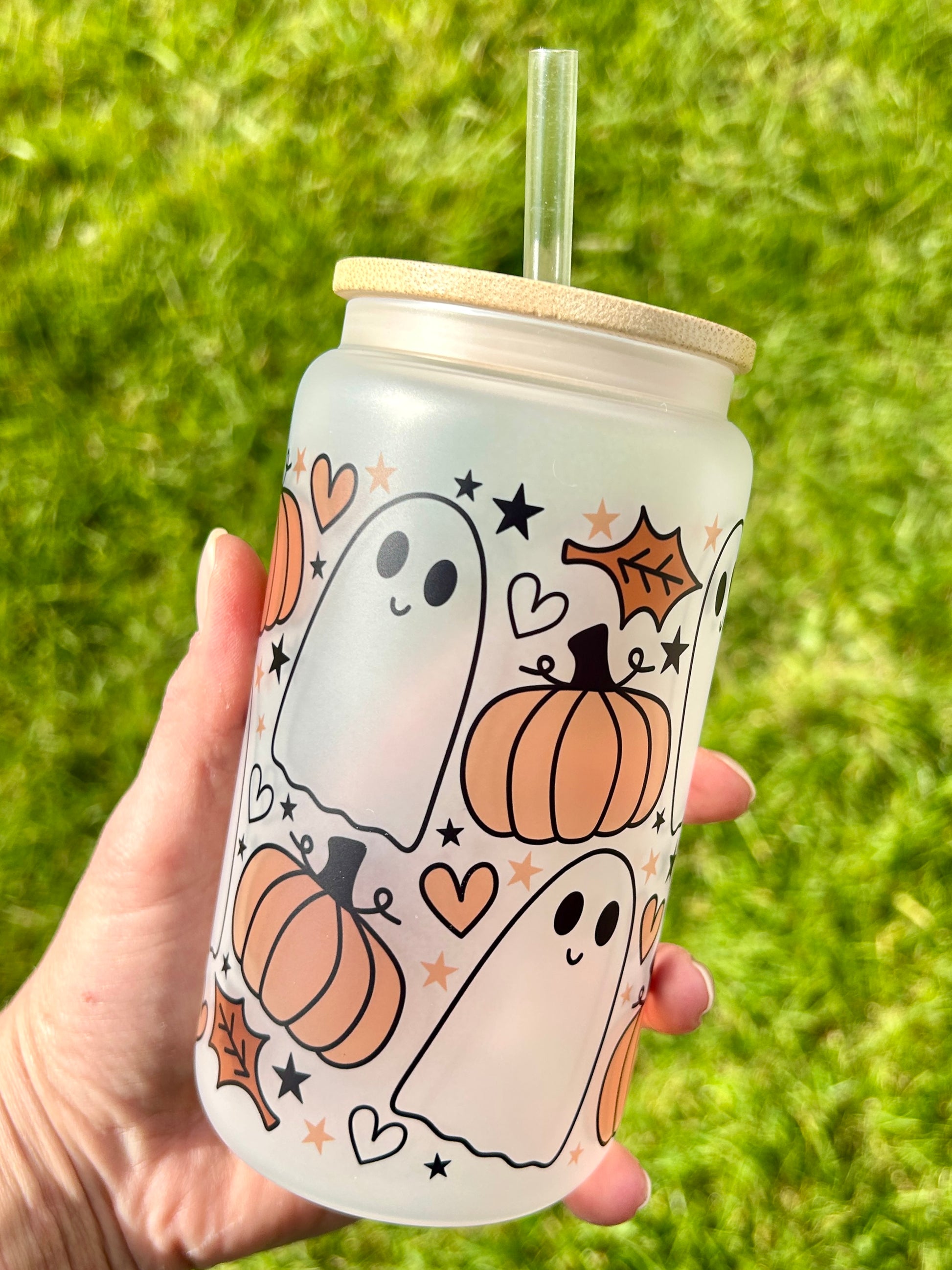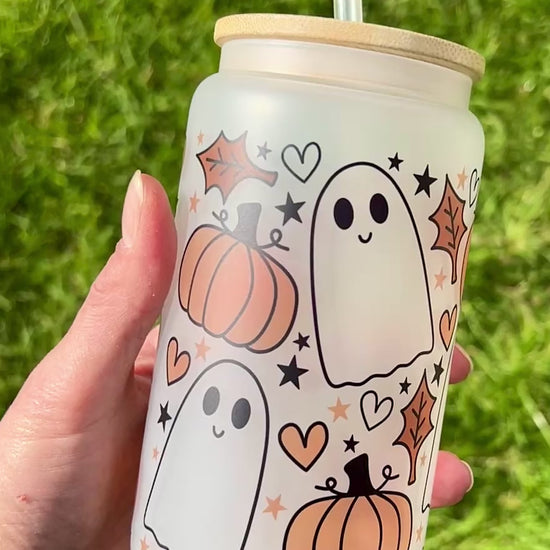 Pumpkins & Ghosts - Libbey cup - glass can with bamboo lid and glass straw